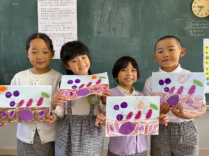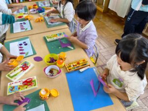 おいもの形に切ったあとは、「たくさんおいもを描こうかな!」、「大きなおいもを描こう!」と、