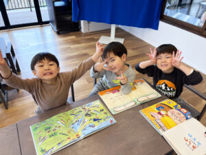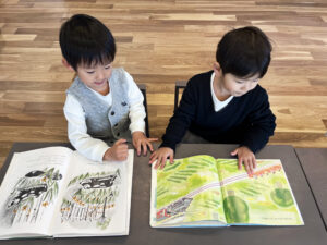 「見て!」と隣のお友だちに絵本を見せる姿も見られ…