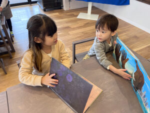 「見て!」と隣のお友だちに絵本を見せる姿も見られ…